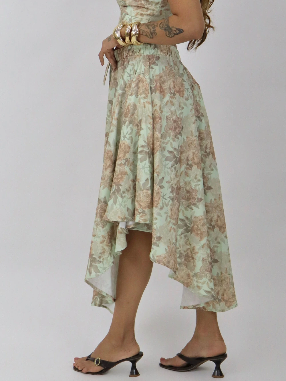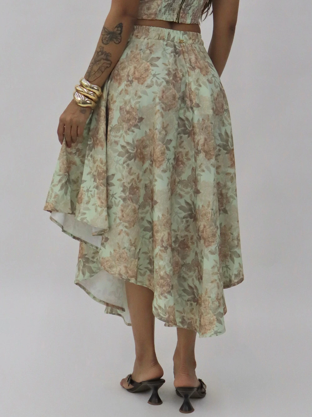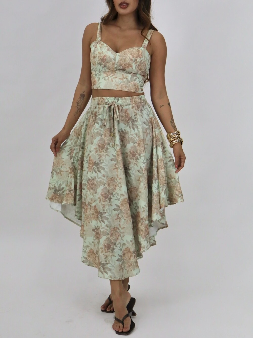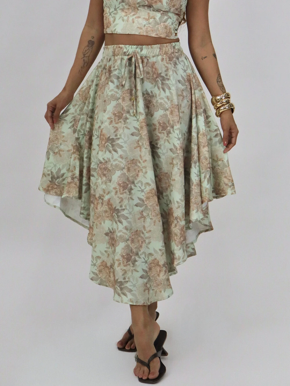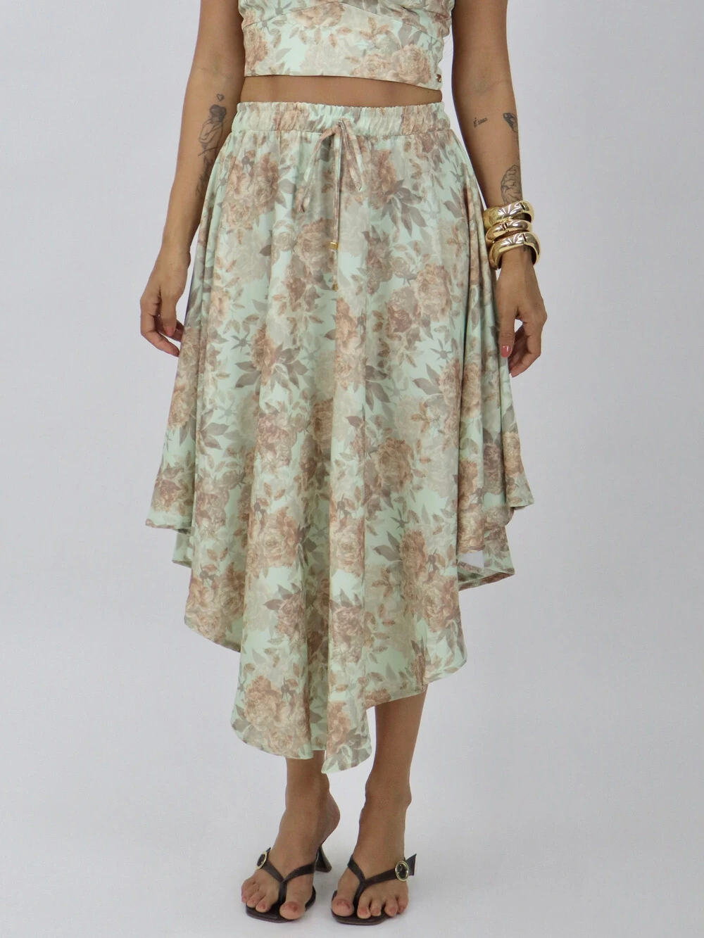 Saia longa estampada com cós elástico e amarração frontal