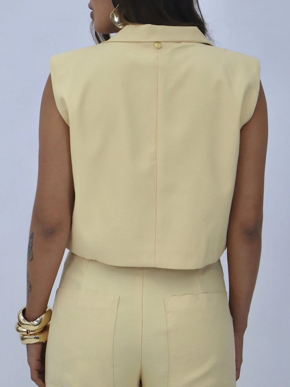 Colete com ombreiras, lapelas na barra e abotoamento frontal