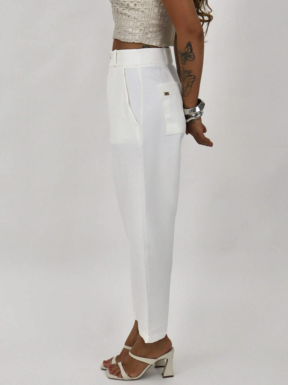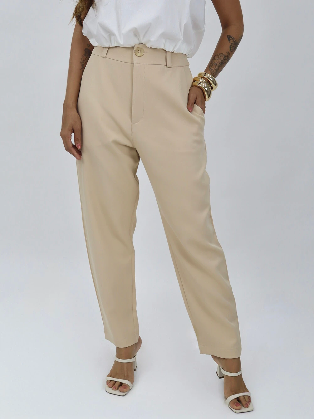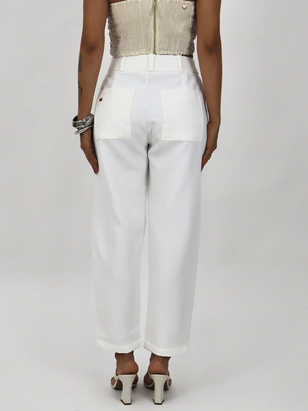Calça com bolsos laterais e traseiros, fechamento com botão e zíper frontais