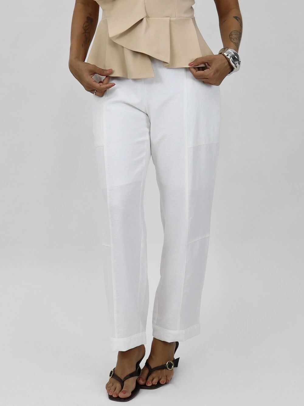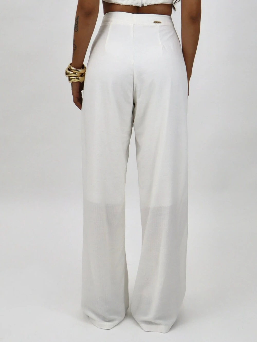 Calça com recortes, bolsos laterais e traseiros e fechamento com zíper lateral