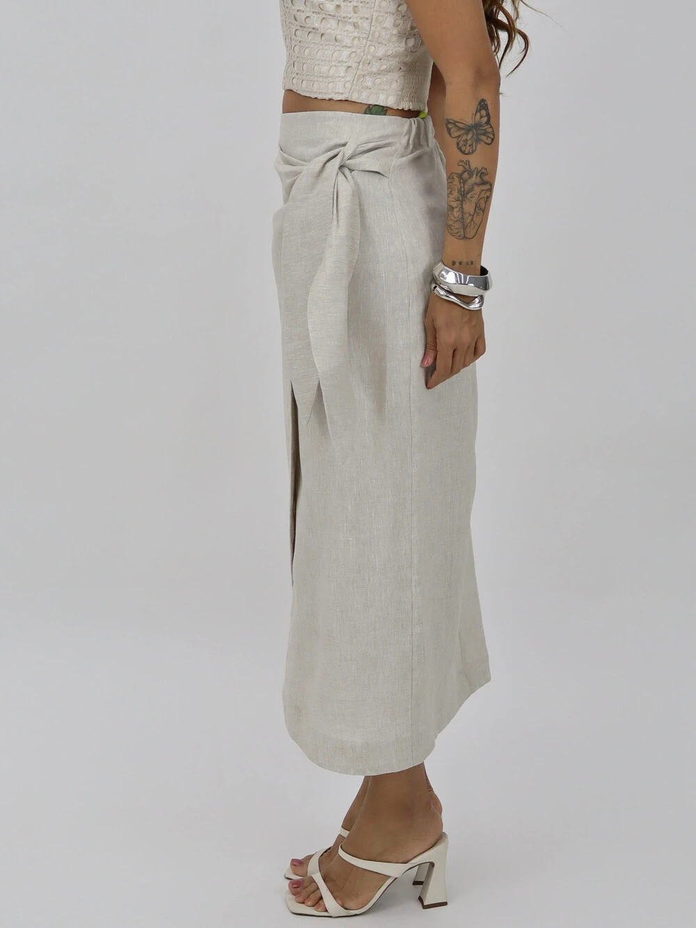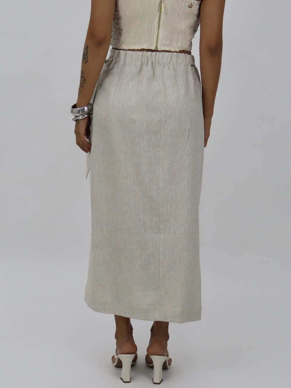 Saia modelo pareô, cós alto, amarração lateral com transpasse e elástico traseiro